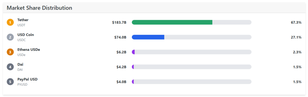 Smaller stablecoins like Ethena USDe, DAI, and PayPal USD make up a much smaller portion of the market but signal ongoing diversification among providers, the data tracker said.
