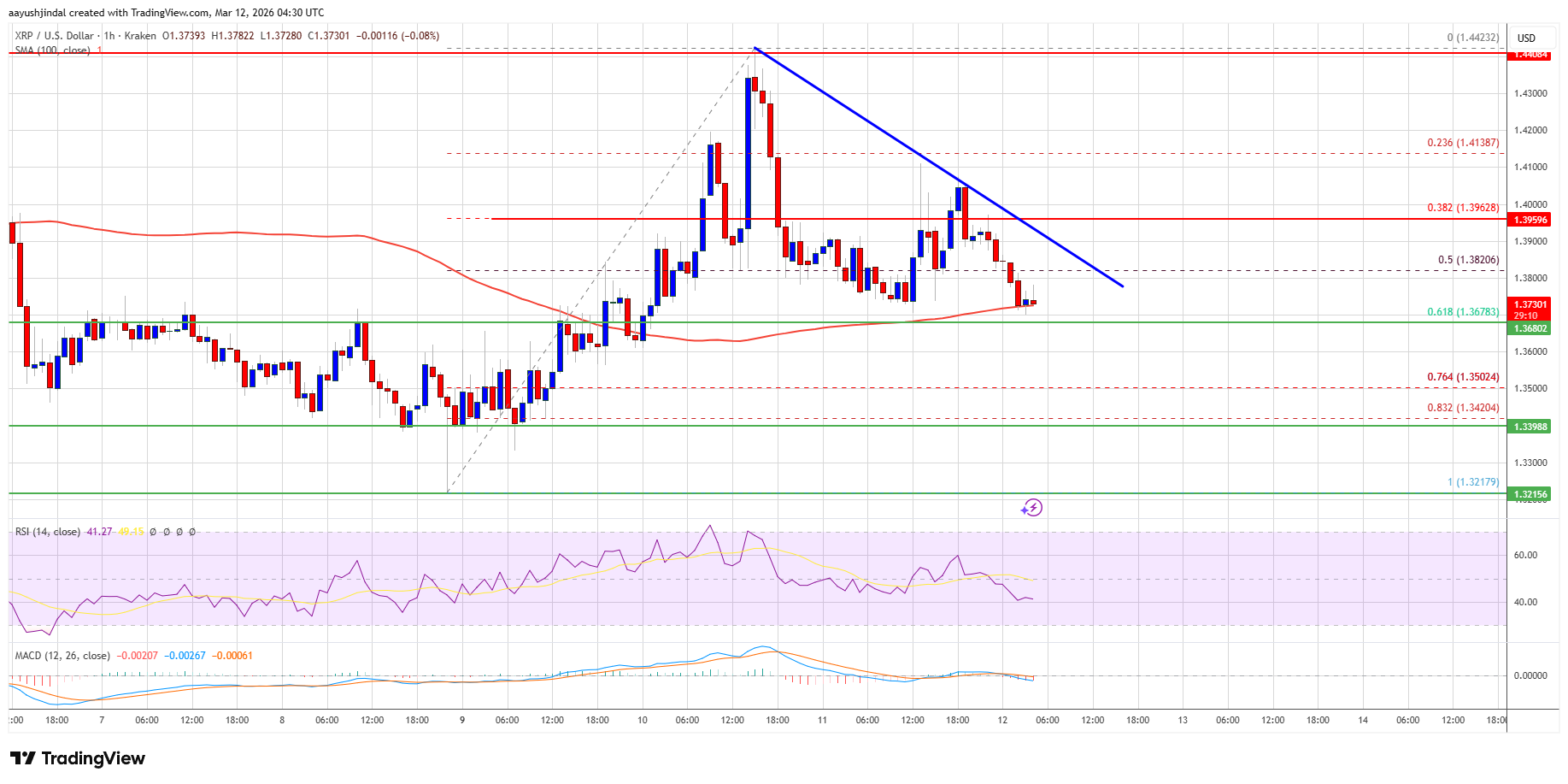 If XRP fails to clear the $1.40 resistance zone, it could start a fresh decline. Initial support on the downside is near the $1.370 level. The next major support is near the $1.3680 level and the 61.8% Fib retracement level of the upward move from the $1.3217 swing low to the $1.4430 high.